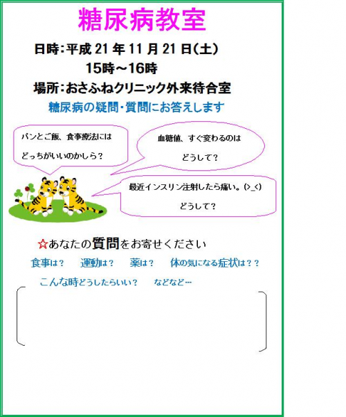 今年最後の糖尿病教室を開催します。1年を通して勉強してきた事で、あんな事・こんな事・いろいろ聞いてみたいと思われる事を、どしどし質問してください。