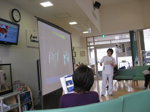 まず、関節リウマチの病因・血液検査の見かたや治療薬について。また、関節を守る為の日常生活の工夫や関節に負担のかからないようにするためのポイントを看護師より話をしました。