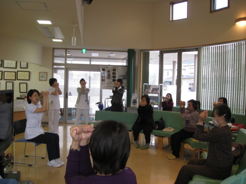 最後に療法士よりリズムに合わせて関節をしっかり動かすリウマチ体操を習い、みんなで行いました。