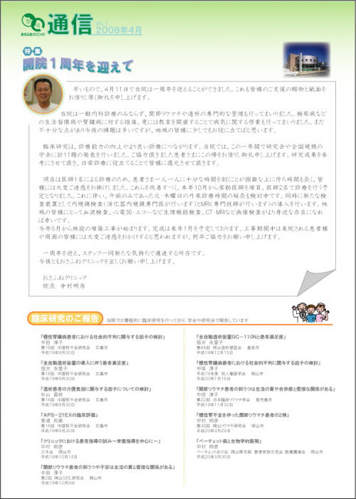 開院一周年を記念して、「おさふねクリニック通信」を発行いたしました。毎月1日に発行し、待合室にご用意しております。みなさまどうぞご覧ください。